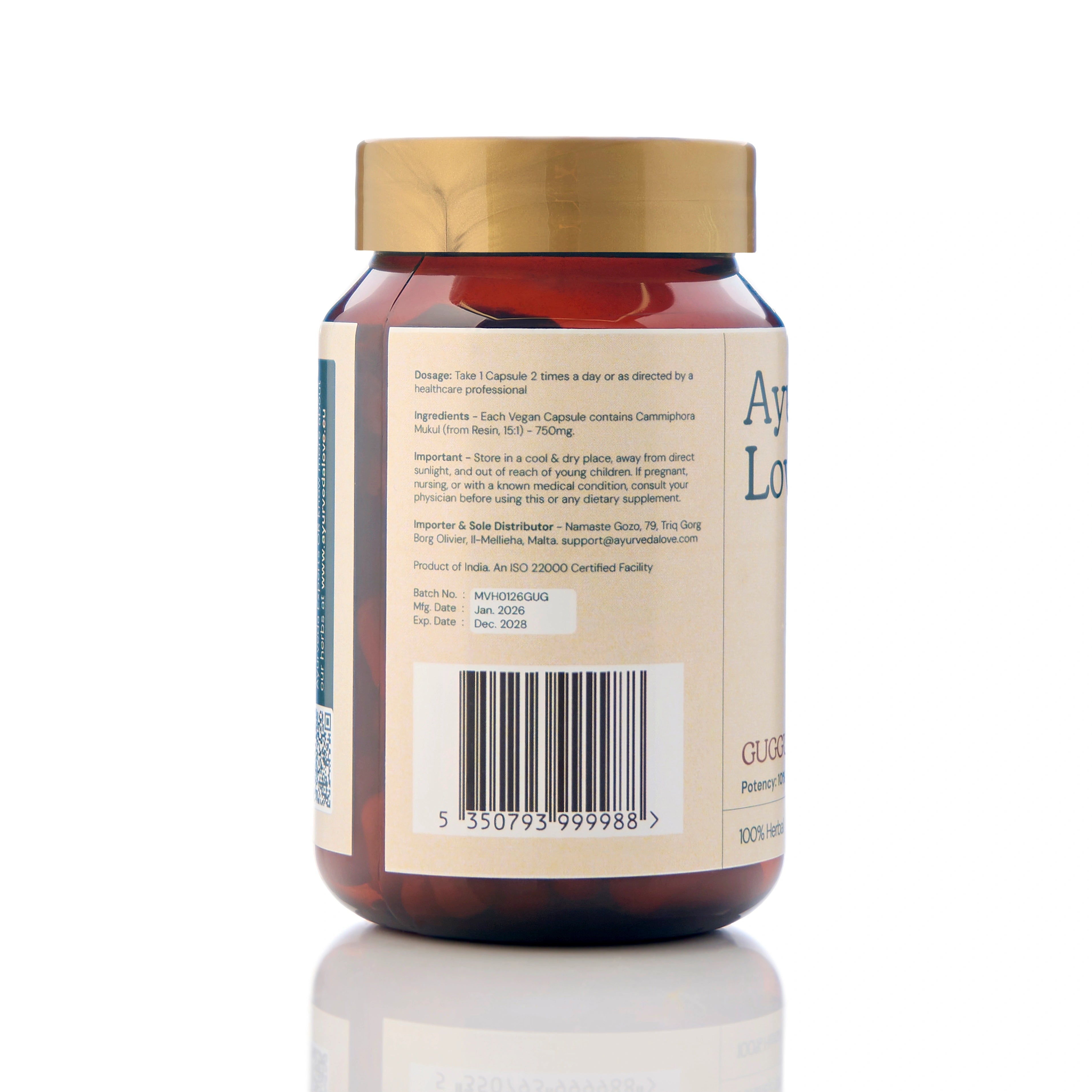Quality and safety: Available in capsule form, carefully processed to retain maximum potency. Consult your Ayurvedic practitioner or healthcare provider before use, as dosage varies based on individual constitution and health conditions. Inform your provider about any medications, as Guggul may interact with certain drugs.